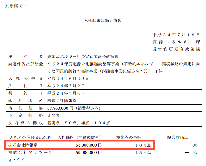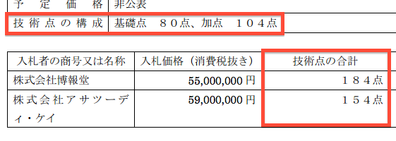 つまり、博報堂は、満点の184点で、しかも落札価格も最安値(とは言っても2社の競合だが)で落札したということになる。
