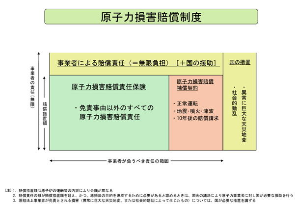原子力事業者による損害賠償を定めている原子力損害賠償法(原賠法)では、通常の商業規模の原子炉の場合の賠償額は1200億円となっている。この賠償額を超える損害が生じ、原子力事業者が自らの財力では全額賠償できない等の事態が生じた場合、国が原子力事業者に必要な援助を行い、被害者救済に支障が生じないようにするとしている。視点は被害者救済である。