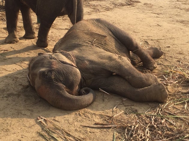 ゾウのミアは、新しい家への2000キロの旅の後であまりに安心したのか、横になってぐっすりと昼寝を始めた。