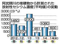 春と比べ、梅雨や台風の大雨などで落ち葉などが下流に流された秋は濃度が下がる傾向にあるという。最高濃度は13年春の1地点の2万2800ベクレルだった。地点ごとにばらつきは大きいが、堆積物がたまりやすい場所は時間が経過しても濃度が下がりづらいという。